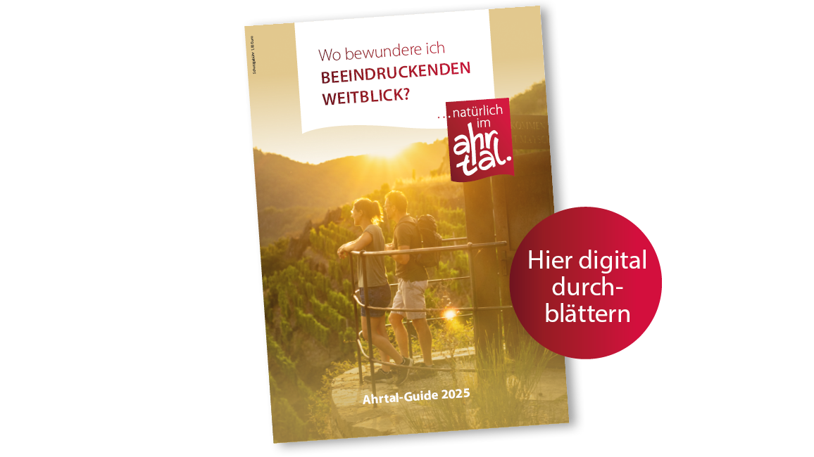 Bestell dir deinen druckfrischen Ahrtal-Guide am besten gleich direkt nach Hause. Du erhältst den Ahrtal-Guide natürlich ebenfalls in unseren Tourist-Informationen im Ahrtal. Wer schon einmal einen Blick in den Ahrtal-Guide werfen möchte, kann das brandneue PDF auch digital durchblättern. Viel Spaß beim Schmökern!