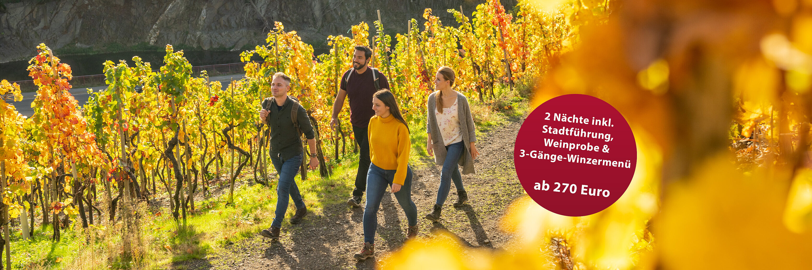 Die steilen Weinberge entlang der Ahr locken nicht nur mit herrlichen Wandertouren und fantastischen Aussichten. Sie gewähren auch einen Einblick in eines der bekanntesten Rotweinanbaugebiete Deutschlands und in die Welt des Ahrweins! Bei einer Weinprobe in einem Weingut hast du die Möglichkeit, erlesene Ahrweine direkt beim Winzer zu verkosten und mehr über die Weinproduktion zu erfahren. Lass dich von einem erfahrenen Gästeführer durch die Straßen der historischen Altstadt von Ahrweiler führen und erfahre Wissenswertes rund um die Stadtgeschichte und den Ahrwein inklusive einer 2er-Weinverkostung. Außerdem kannst du dich auf ein köstliches 3-Gänge-Winzermenü freuen.