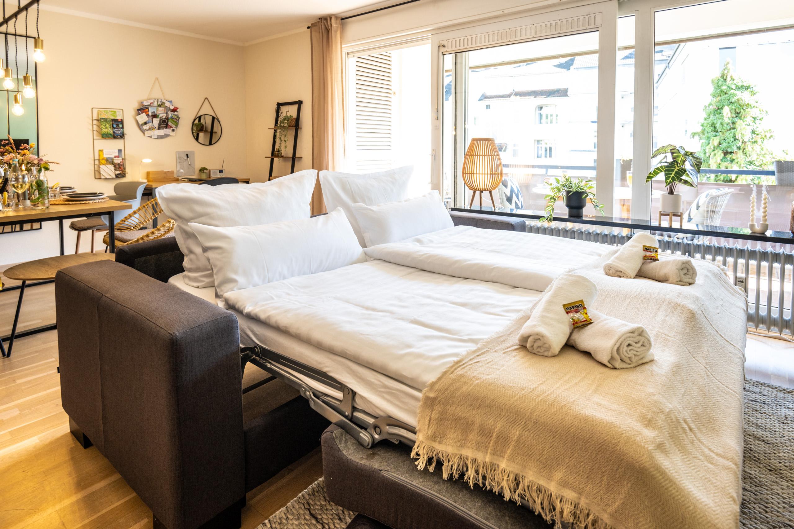 Das Apartment liegt im 2,5 Stock und ist stilvoll eingerichtet und mit modernem Komfort ausgestattet. Freuen Sie sich auf ein gemütliches Bett, einen Flachbildfernseher und kostenloses WLAN, damit Sie sich wie zu Hause fühlen können. Die moderne Küche ist komplett ausgestattet und bietet Ihnen alles, was Sie für die Zubereitung Ihrer Mahlzeiten benötigen. Zudem steht Ihnen im Keller eine Waschmaschine zur Verfügung, damit Sie auch auf Reisen immer frische Kleidung haben.