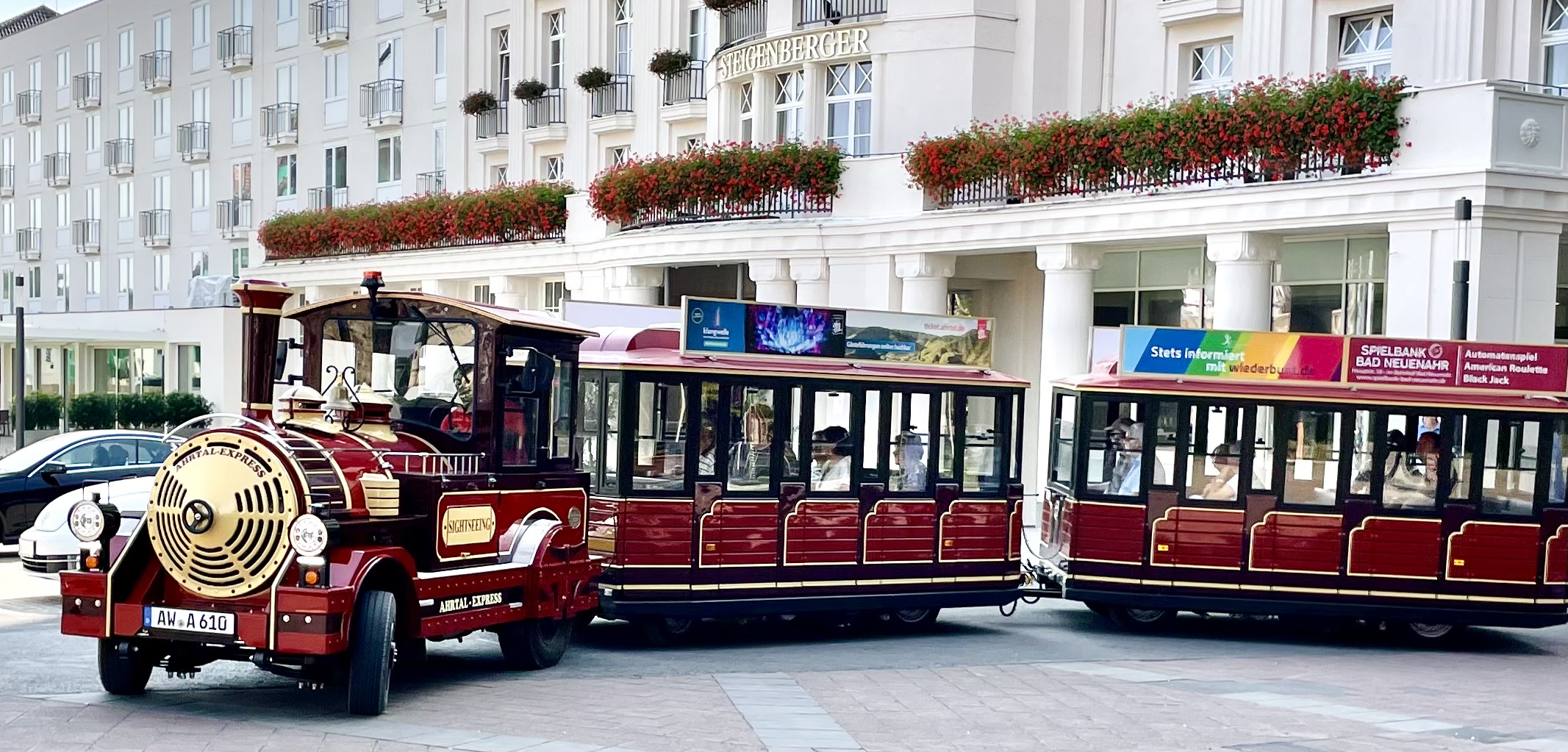Mit der Nostalgie-Bahn „Ahrtal-Express“ lässt sich Bad Neuenahr-Ahrweiler auf entspannte Weise entdecken. Während der 50-minütigen Rundfahrt (inkl. 10 Minuten Pause) erfährst du über Lautsprecher Spannendes zum Heilbad Bad Neuenahr und dem historischen Ahrweiler. Die Fahrt ist als Rundtour oder einfache Verbindung mit Zwischenstopp möglich. Der Ahrtal-Express ist umweltfreundlich, beheizbar und rollstuhltauglich – ideal für einen gemütlichen Einstieg ins Ahrtal.
