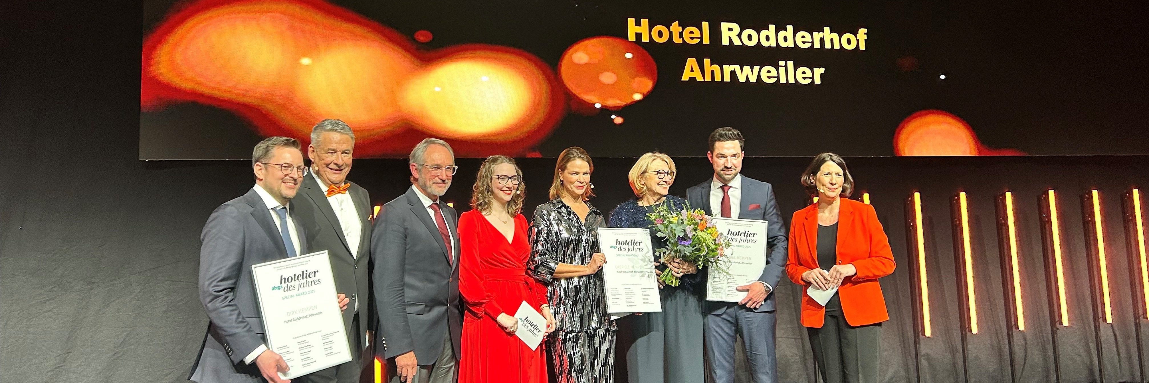 „Der Rodderhof ist ein Paradebeispiel für den Wiederaufbau. Mit der Auszeichnung würdigen wir den großen Mut und die Schaffenskraft des Familienbetriebs“, erläuterte Westermann stellvertretend für die Jury. Die Familie Hempen hat ihr Hotel Rodderhof in der Ahrweiler Altstadt, das durch die Ahr-Flut 2021 schwer beschädigt wurde, innerhalb von nur einem Jahr mit großem Engagement und einer Vision für die Zukunft wiederaufgebaut. In dieser Zeit erfolgte zusätzlich die Weitergabe des Hotels innerhalb der Familie an Daniel Hempen. Auch die rheinland-pfälzische Wirtschaftsministerin Daniela Schmitt hob in ihrer Laudatio die Wiederaufbauleistung des Hotels hervor.