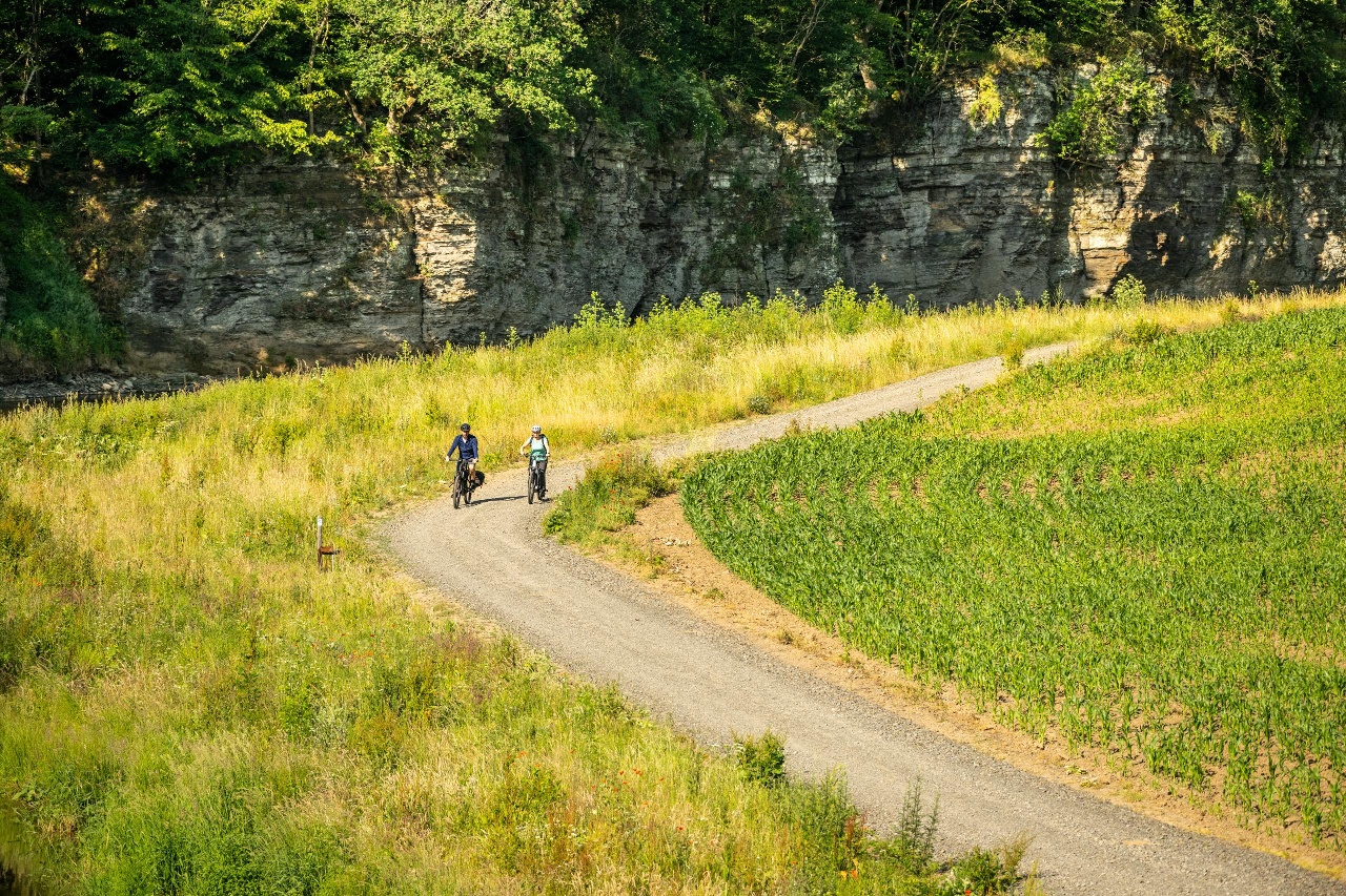 Markante Naturdenkmäler wie der Aremberg oder das Prümer Tor tragen zum beeindruckenden Naturerlebnis im idyllischen Oberen Ahrtal bei. An der Mittelahr weitet sich das Tal und der Ahr-Radweg lädt zum entspannten Radeln bis Ahrbrück ein.