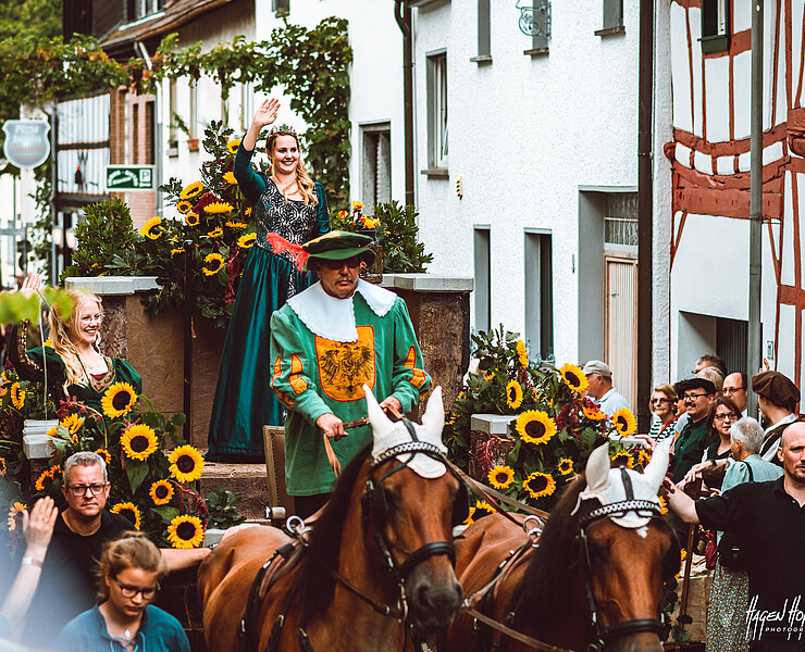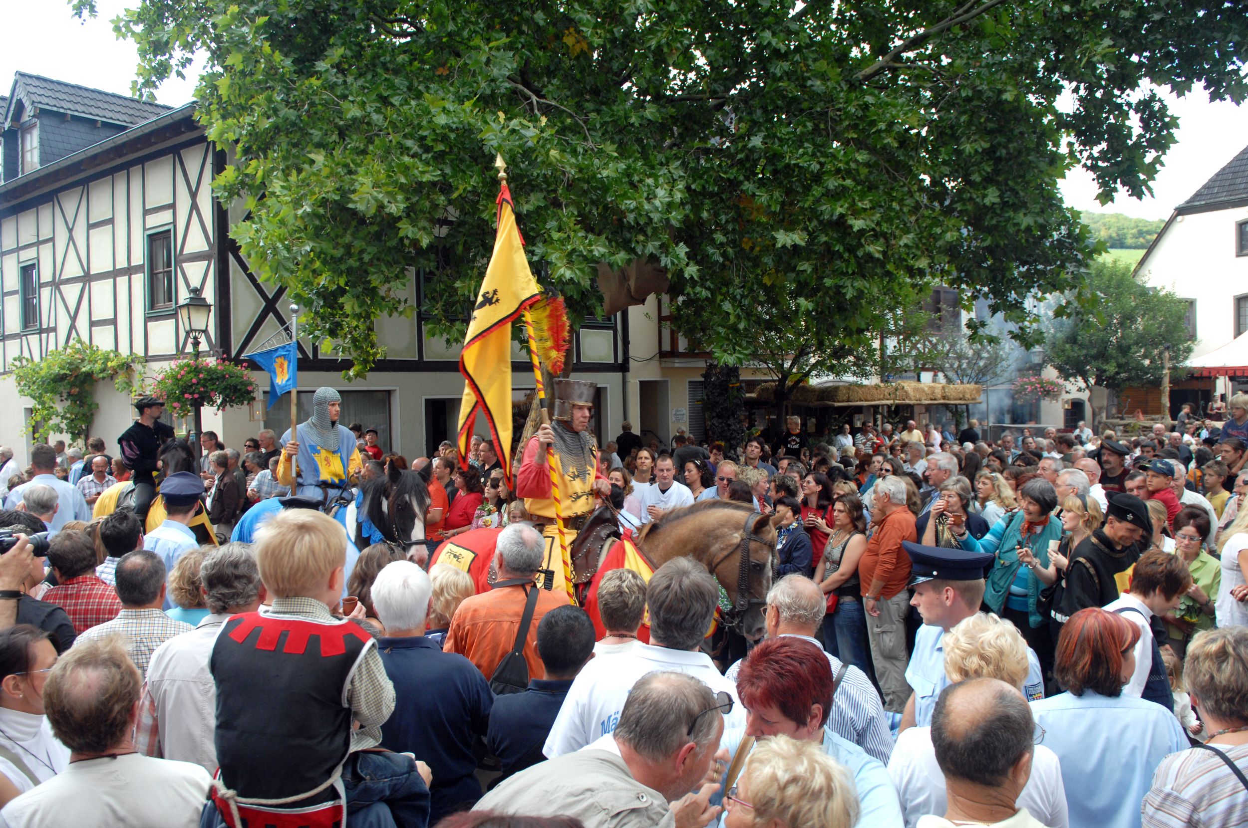 Ab 18 Uhr: Eröffnung und Inthronisation der neuen Weinhoheit auf dem Heimersheimer Marktplatz mit Live-Musik. Im "Bauernlager" am Westtor.
