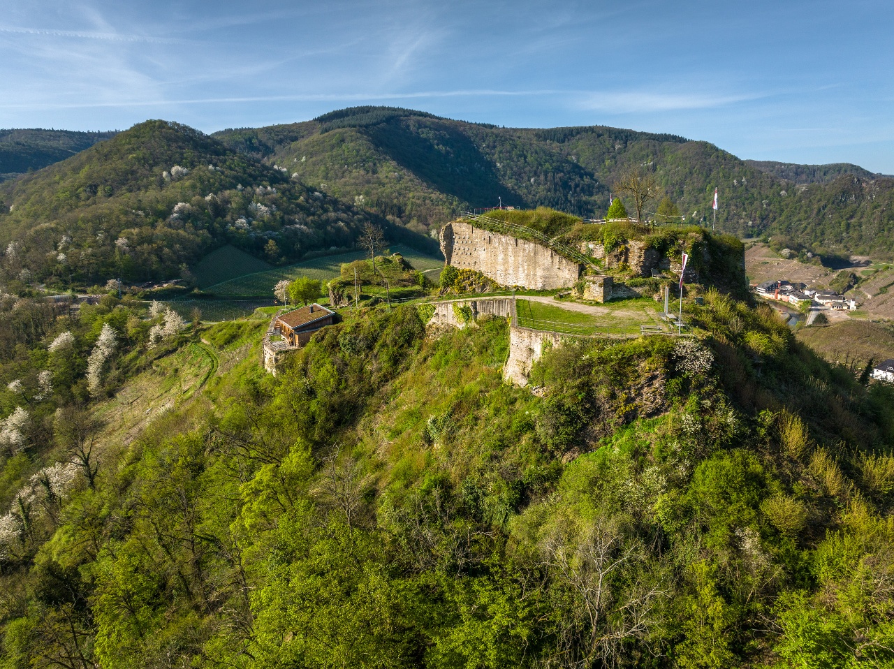 The route lives up to its name: the Saffenburg is visible from almost every viewpoint. The hike leads to spectacular views: from the Saffenburg, from the Schwedenkopf, the Ümerich and the Mohrenkopf. A challenging circuit that offers new surprises around every bend. A highlight right at the start: the ruins of the Saffenburg. From the plateau you get a magnificent 360° panoramic view of the course of the Ahr and the surrounding towns. Refreshment opportunities are available along the way at the Saffenburg shelter, in the local gastronomy, and at the winemakers and wine taverns in Mayschoß and Rech. The Saffenburg circuit is marked with its own trail sign.